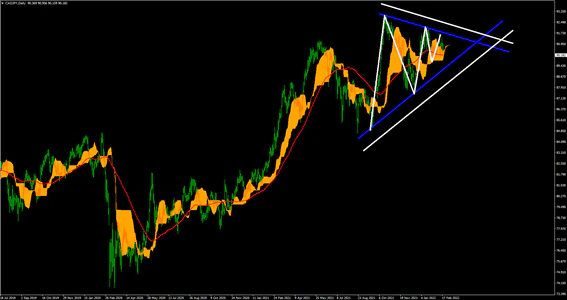 CADJPYの日足では三角持ち合いの形成がなされている。