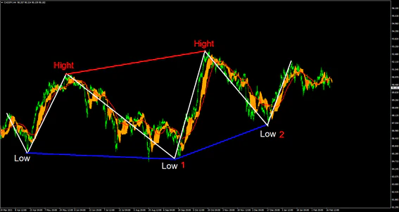 ダウ理論上では高値安値の切り上げ下げが行われることでトレンドが変化すると言われており、Lowの切り下げが赤文字1~2の部分で切り上げに変化している。