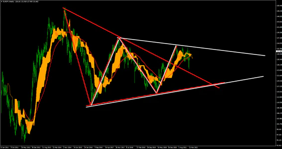 EURJPYの週足では2つの三角持ち合いが見て取れる。