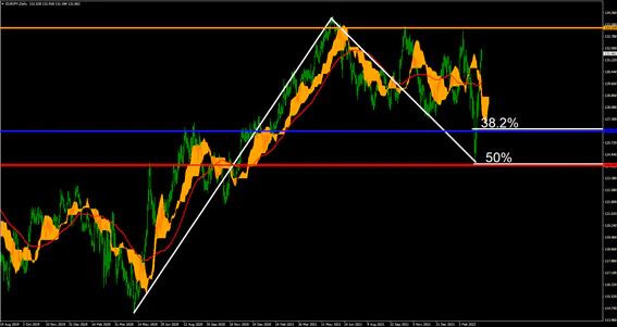 EURJPYの日足では大きなトレンドの50%がウクライナ問題で意識されており、現在は戻りを試す展開となっている。