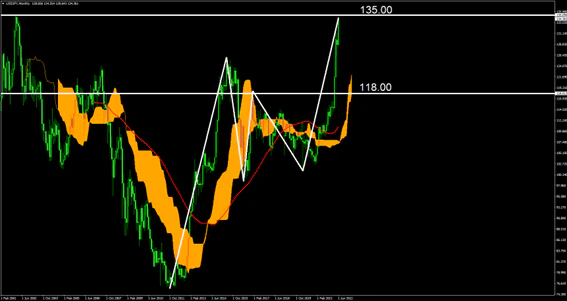 USDJPYの月足では135円の価格帯が上値抵抗線となっている。