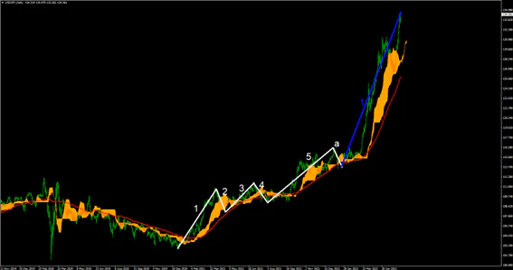 USDJPYの日足では1-5波の推進波を付けた後に再度の上昇を付ける形となっている。