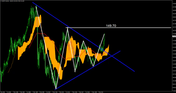 EURJPYの月足では超長期で推移してきた三角持ち合い、ダウ理論の上値の切り下げと下値の切り上げを繰り返して力が収束する形となっていたものが上抜けとなっている。