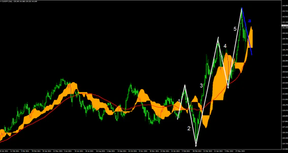 EURJPYの日足では波動論上の1-5波での推進波を形成後のa-cの調整波のa波を付けていると思われる。