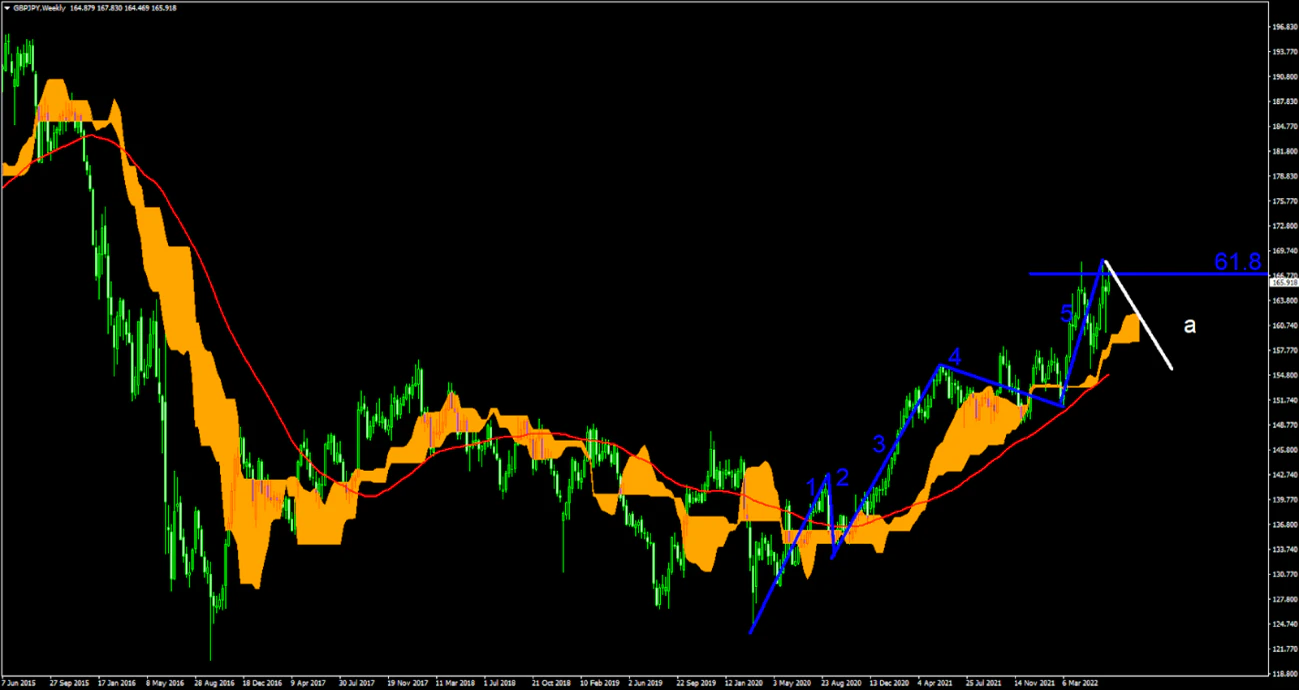 GBPJPY週足では波動論、推進波の1-4が終わり5波目の形成部分となっている。