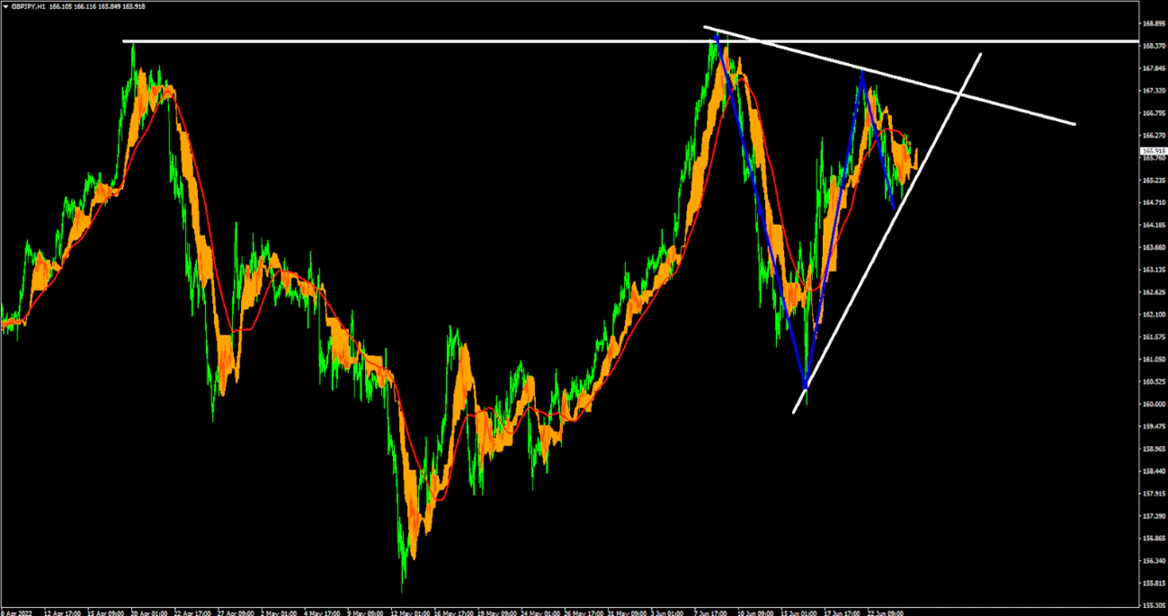 GBPJPYの1時間足では三角持ち合いからの抜けの可能性となっている。