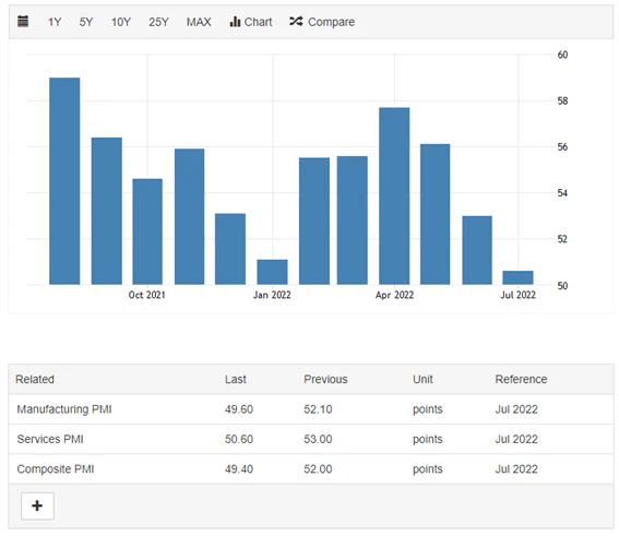 また、ユーロ圏7月PMIでは製造業がさらに縮小、サービス業も停滞するなど市場予想以上の速度で経済後退が発生しているようだ。