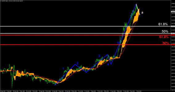 USDJPYは波動論上の1-5波となる推進波の形成が終わりつつあり、調整波のa波の形成途中となる推移となっている。