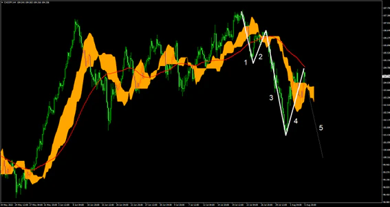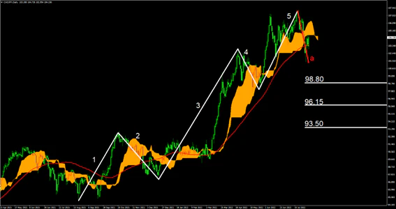 CAD/JPYの日足では波動論上の推進波1~5波が終わり、調整波aもしくはbの形成がチャートより見て取れる。