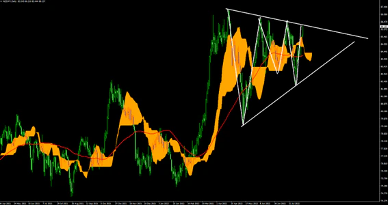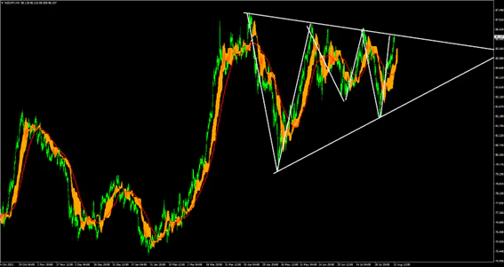 NZD/JPYの日足では三角持ち合いでの収束がみられる。