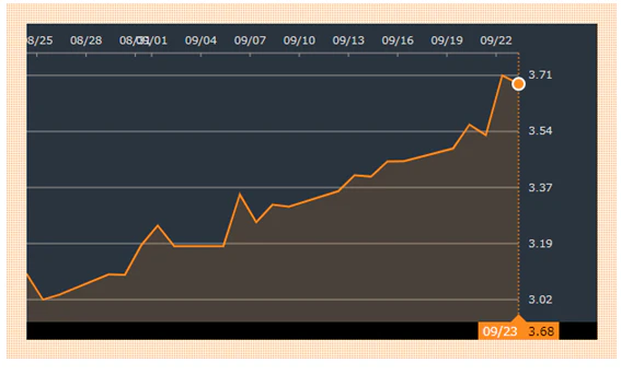 高値から20%以上の下落となった場合、弱気相場入りになると言われており、ダウ工業平均は1月4日の最高値36799.64から、9月23日の29590.41まで19.6%の下落となっておりかろうじて弱気相場入りは回避できたものの、このままの市場心理・弱気の市場動向のまま推移すれば弱気相場入りは確実となりそうだ。