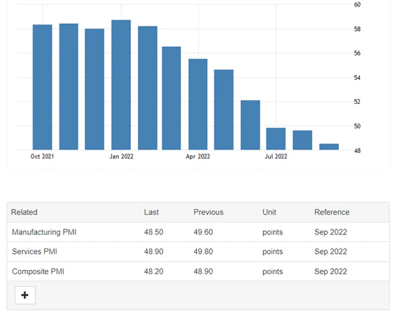 欧州市場も続落しており、中央銀行のタカ派的な動きへの懸念、9月のユーロ圏総合購買担当者景気指数の低下などが市場の上値を抑え、市場を押し下げる形となっている。