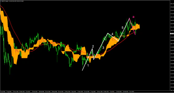 GBP/JPYの週足では上昇トレンドで形成されていた波動論上の推進波が終わりを迎えつつある様に見受けられる。