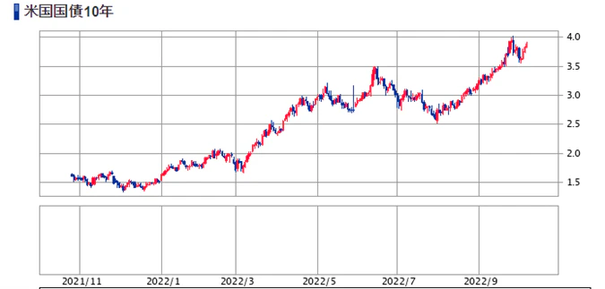 画像は「USD/JPYの2020年3月~2022年10月7日迄のUSD/JPY日足」と米国10年債の2021年からのチャートを並べているが、米国金利が3%水準を目指し始める部分からUSD/JPYも円安ドル高展開となり、3%を超えてからは為替のドル安は発生しにくい展開となっている。