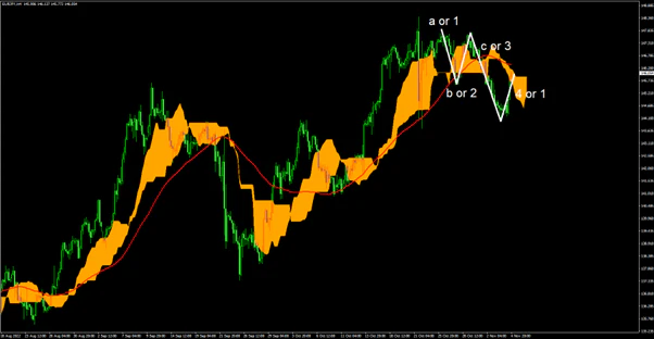 EUR/JPY4時間足では波動論上の推進波とも調整波とも捉えられる形となっている。