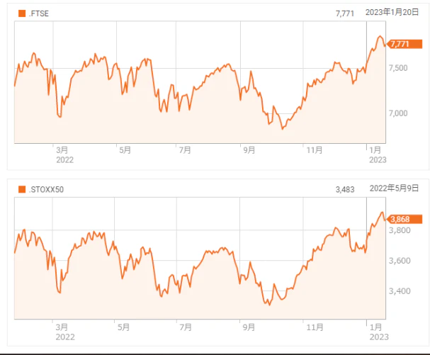 EU市場では中国経済の経済活動再開への期待などから市場の底支えとなってはいる事や欧州の冬が想定以上に暖かく、エネルギー問題で一定の猶予が与えられたころなどが投資家心理の改善と市場での買いと言う形で市場は小幅に値を上げる形が続いている。