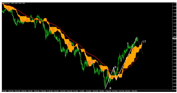 EUR/USD日足では大きな下降トレンドからの戻り、調整波によるa-cが形成されている。