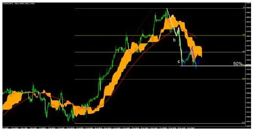 1時間足と4時間足のチャートを並べて表示しているが、1時間足では下降トレンド(調整)での調整波a-c波の形成がされており、高値安値の50%が既に意識されている事が見て取れる。