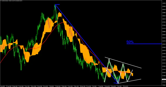 AUD/CADの日足では下降トレンドが終わり、そこからの三角持ち合いでの推移となっている。青のラインが下降トレンドと下降トレンドの値幅の50%を示している。