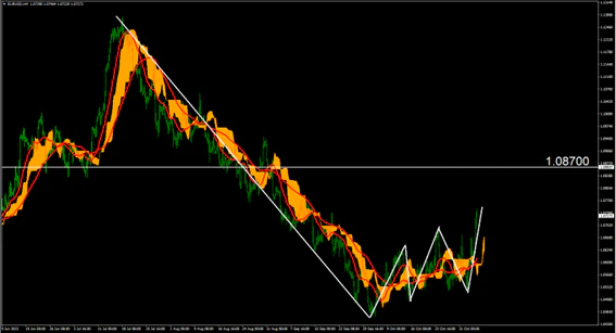 EUR/USD 4時間足では7月18日から10月3日までの下降トレンドからの戻り、上昇へ転じた部分となっている。