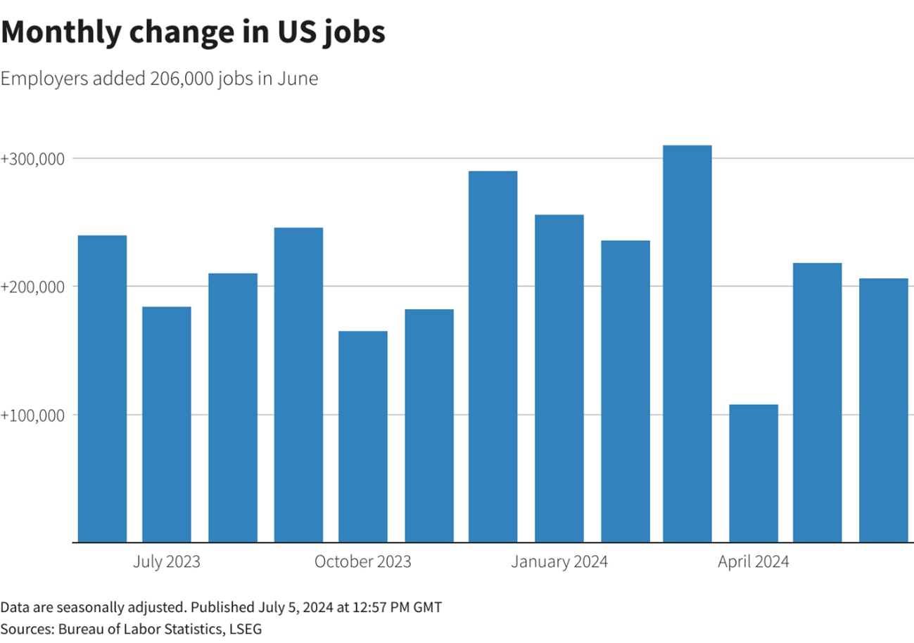 5日の米労働省の6月雇用統計によると、非農業部門雇用者数は前月比20万6000人増と伸びがわずかに鈍化し、失業率は約2年半ぶりの高水準に上昇した。賃金の伸びも鈍化したことから労働市場の緩みが浮き彫りとなる形となったのだが、それが利下げ観測を呼び市場は値を上げるという展開となっている。