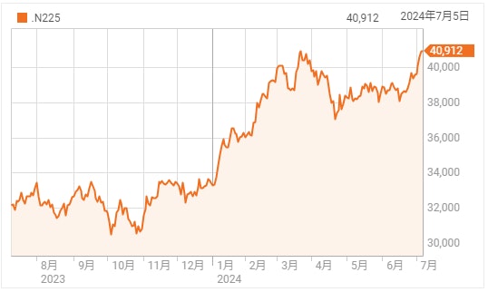 6月17日の38102.44円から40912.37円と2809円の上昇となっており、60日100日で挟まれる展開となっていた時分から大きく上値を超える展開となっている。