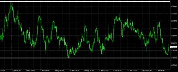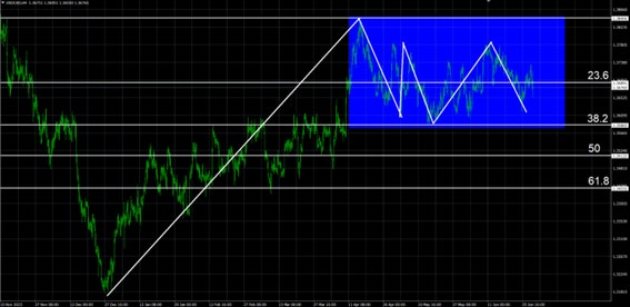 先週案内をしたUSD/CAD4時間足では直近の上昇トレンドの推進波5波が終わり、調整波のa-c波の形成が行われている部分でもあり、青枠内での推移している(図1)。
