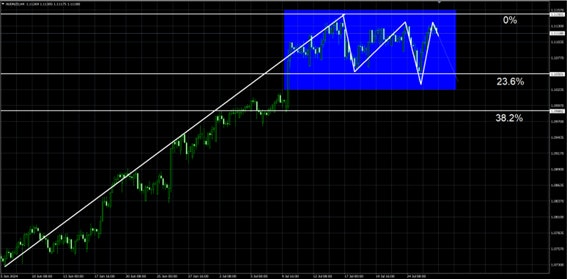 青枠を下抜けた場合には38.2%となる1.09880付近までの下落、1.09880をも超える様であれば50%となる1.09400までの下落も考えられる。