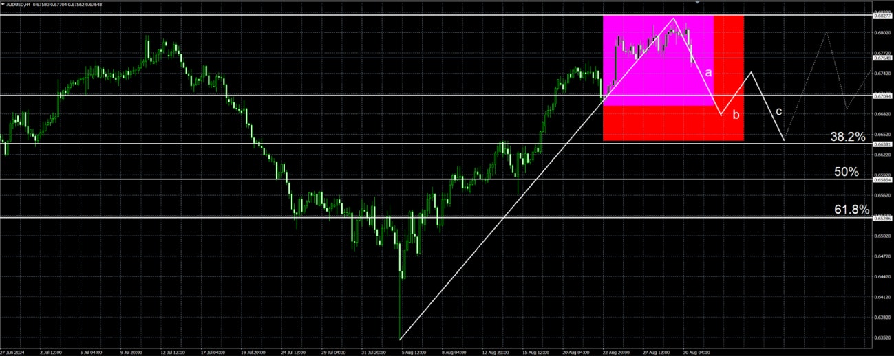 AUD/USD4時間足は上昇トレンド継続中であるのか、ここからのレンジ相場~次のトレンド形成かが分からない部分となっているが、ここからレンジとなった場合にはピンク枠の高値から23.6%、直近の上昇トレンドでつけたトレンド転換の可能性(4波と5波での安値)が23.6%付近である事から、23.6%価格である0.67000付近を意識してのレンジとなるのか38.2%となる0.60380付近にまで値を下げるのかといったところとなっている。