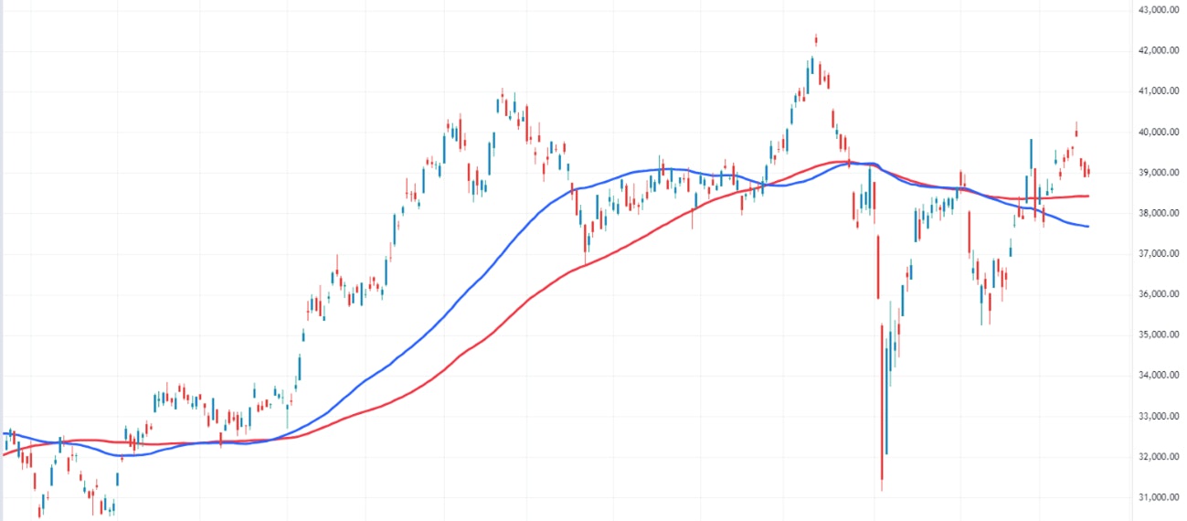 日本市場は40,000円台に一瞬、到達したもの100日移動平均線、60日移動平均線を上回る形で推移しており、下値は100日移動平均線に支えられる形で推移しそうだ。