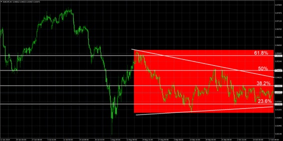 4時間足上では赤四角で囲った価格が上値抵抗線と下値支持線として意識されており、三角持ち合いで焦点(力)が溜まりつつある形ともなっている。