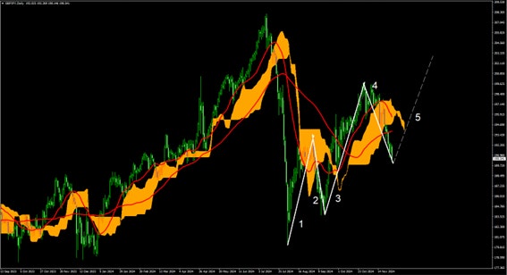 上位時間足のトレンド方向に沿ってトレードを行うのがセオリーなっている事から日足での5波の確認が取れれば、下位時間足での転換でトレンドの波に乗っていく形がよさそうだ。