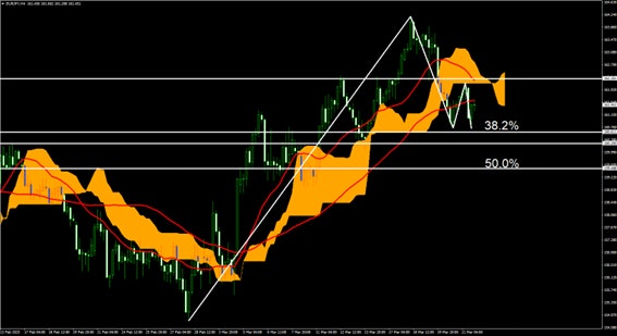 直近安値(160.73)を下回って推移するようであればダウ理論の切り下げを達成で下降トレンドに転換、直近の上昇トレンドで直近高安値の50%までの下降の可能性。
