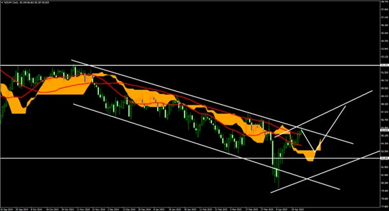 NZD/JPYの日足での判断となるが、現在の価格は緩やかな下降トレンドの途中からトランプ政権による関税措置などの影響で一旦下振れをした部分から、元の価格帯へと値を戻している部分となっており、ここからの上昇が発生すると、トレンドの転換へと移り変わる可能性の見える状況での推移となっている。