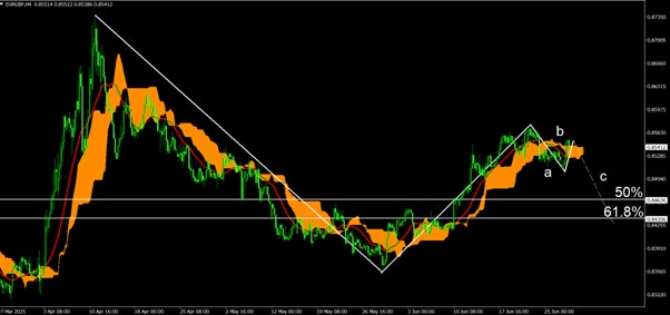 EUR/GBPの4時間足上では下降トレンドからの戻りが終わり、そこからのレンジ・トレンド転換という部分となっている。
