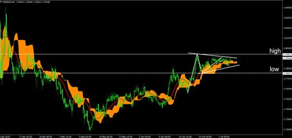 EUR/AUDの4時間足はダウ理論上の切り上げ下げのどちらの可能性も示唆される部分となっている。
