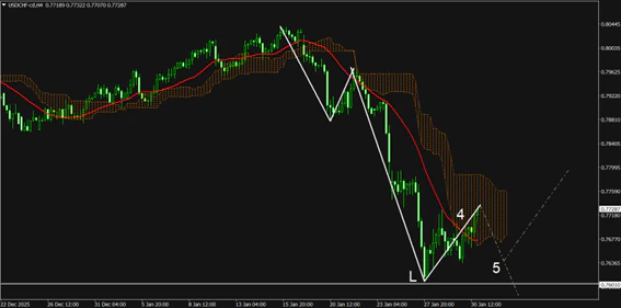 USD/CHFは波動論から見る下降トレンドの推進波第4波の形成途中となっている。