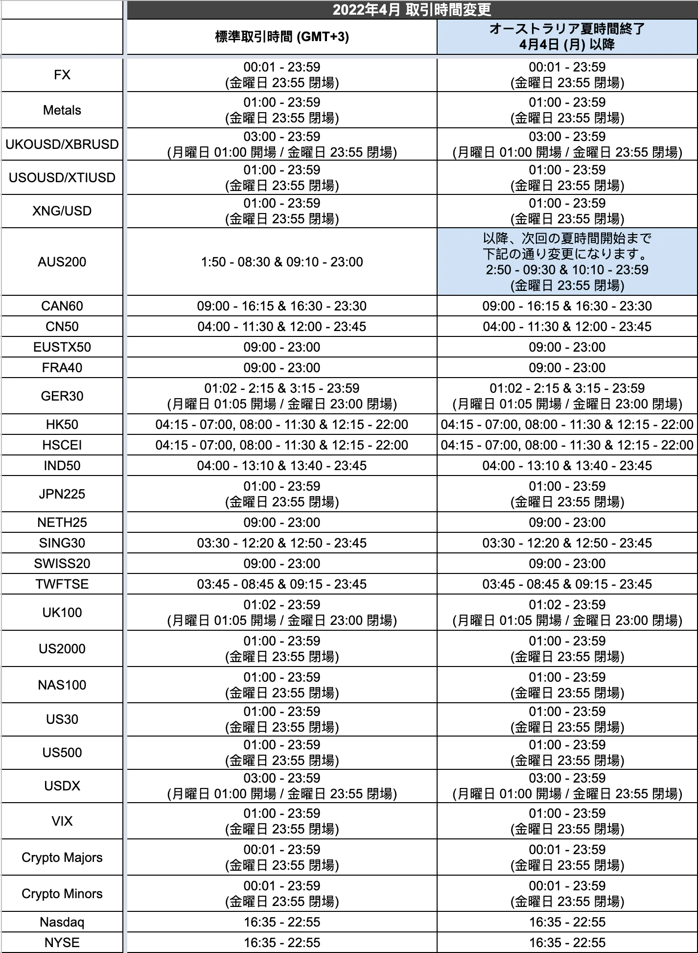 2022年4月4日 (月) 以降、オーストラリア夏時間終了に伴い、AUS200の取引時間がオーストラリア夏時間開始まで、表示の通り変更となります。