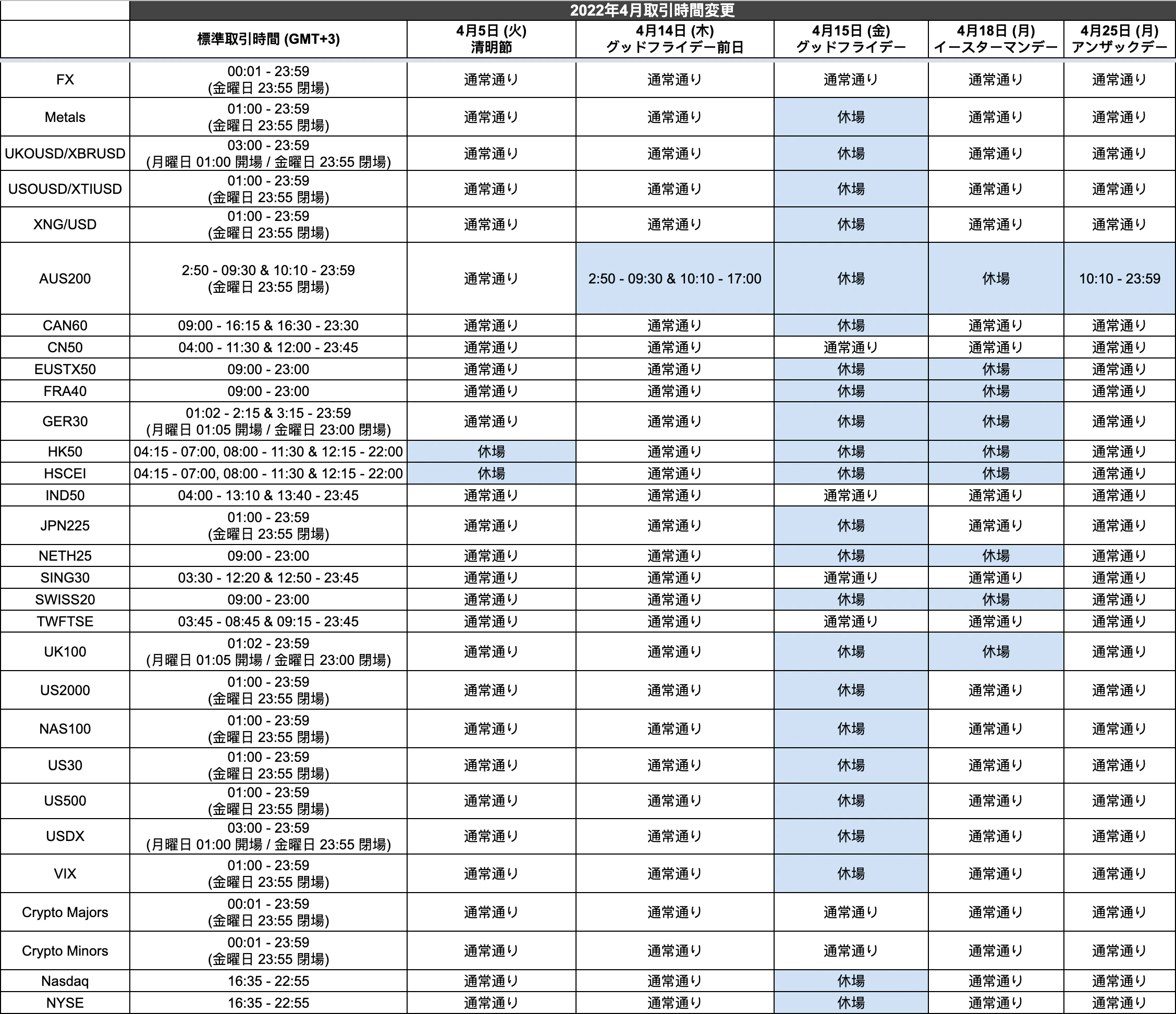 また、4月5日 (火) 清明節 、14日 (木) 〜 18日 (月) イースターホリデー、25日 (月) アンザックデーに伴い、一部取引時間が変更となります。影響がある金融商品の詳細は、下記の表をご参照ください。
