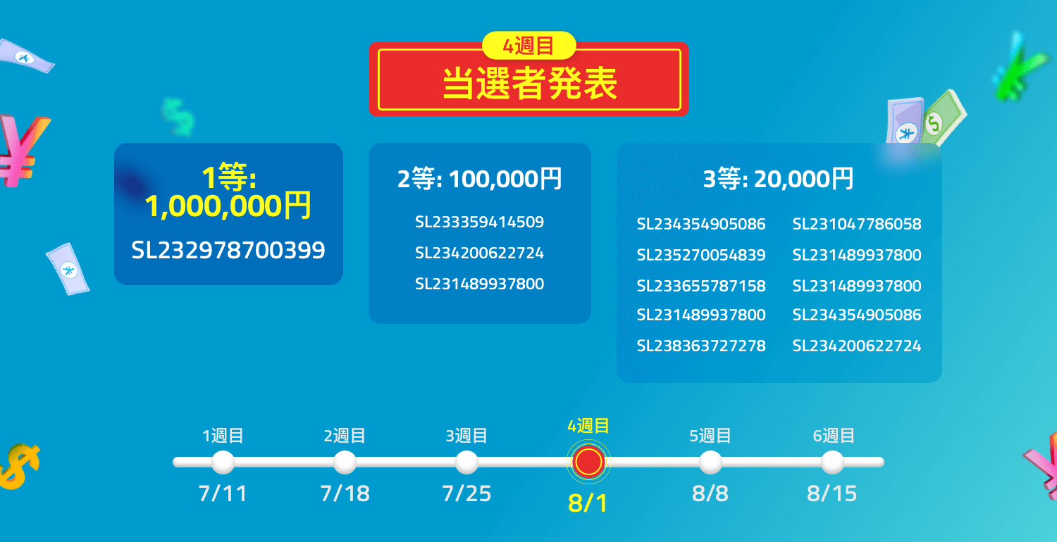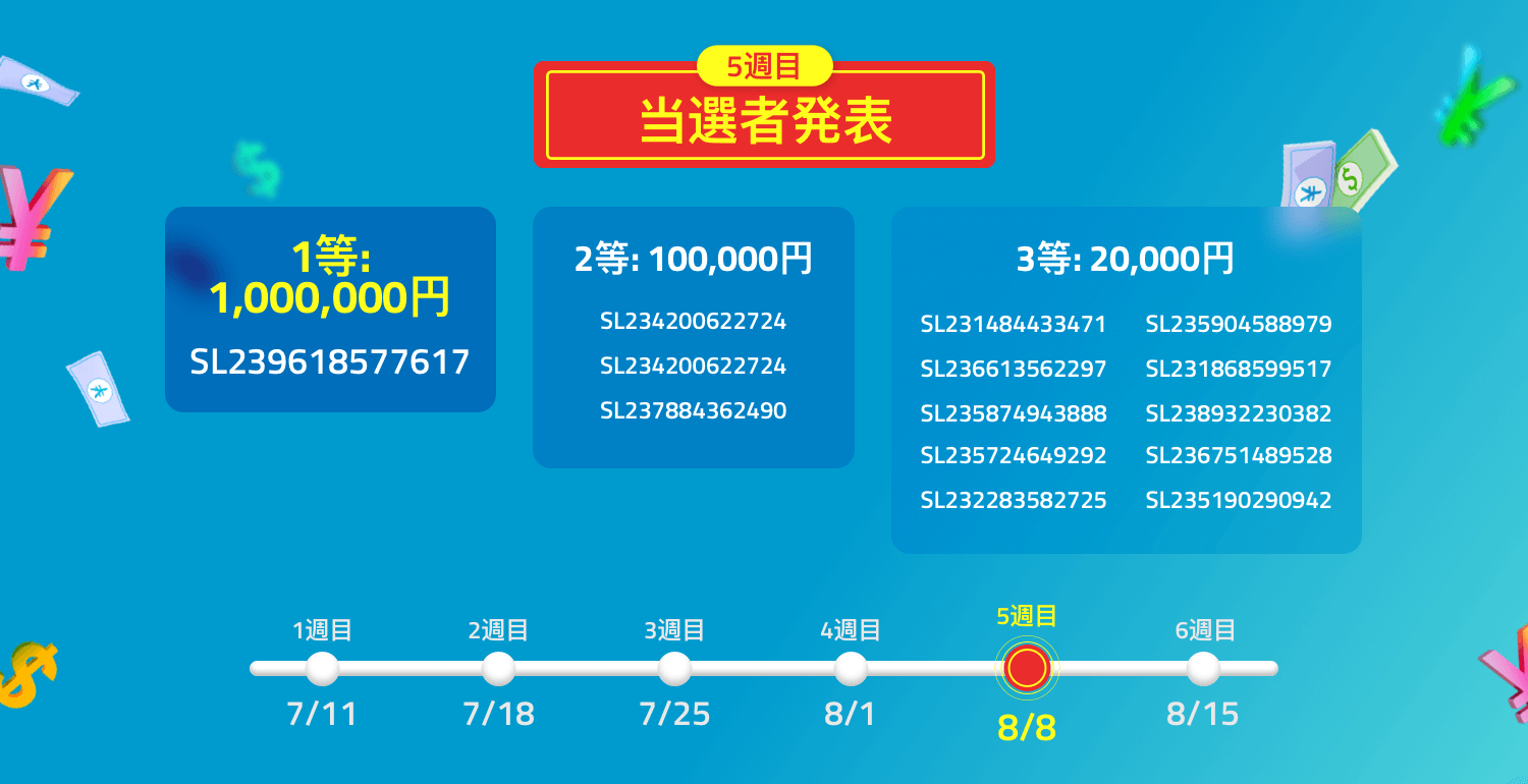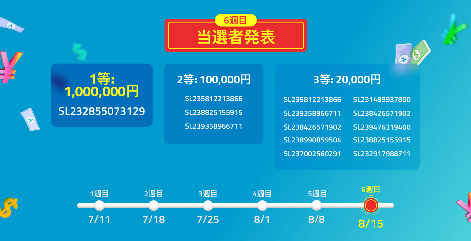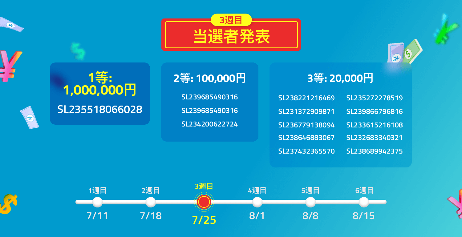 | 特典 | 6週連続抽選で毎週14名様に現金プレゼント 1等: 1,000,000円(1名様) 2等: 100,000円 (3名様) 3等: 20,000円(10名様) |