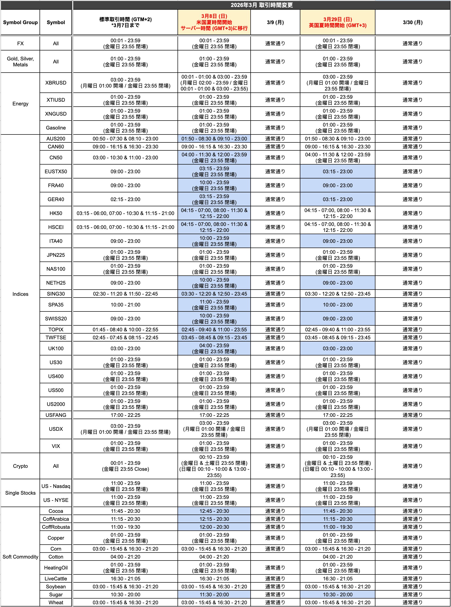 Titan FX Team04th March 2026夏時間(DST)の変更に伴う取引時間の変更について3月8日より、米国の夏時間(DST)移行に伴い、当社のMT4/MT5取引サーバーのタイムゾーンがGMT+2からGMT+3に変更されます。これに伴い、一部の商品の取引時間も変更となります。詳しい変更内容は以下の表をご確認のうえ、取引の計画にお役立てください。画像をクリックすると拡大できます。上記以外の取引時間は通常通り。ほぼ満足