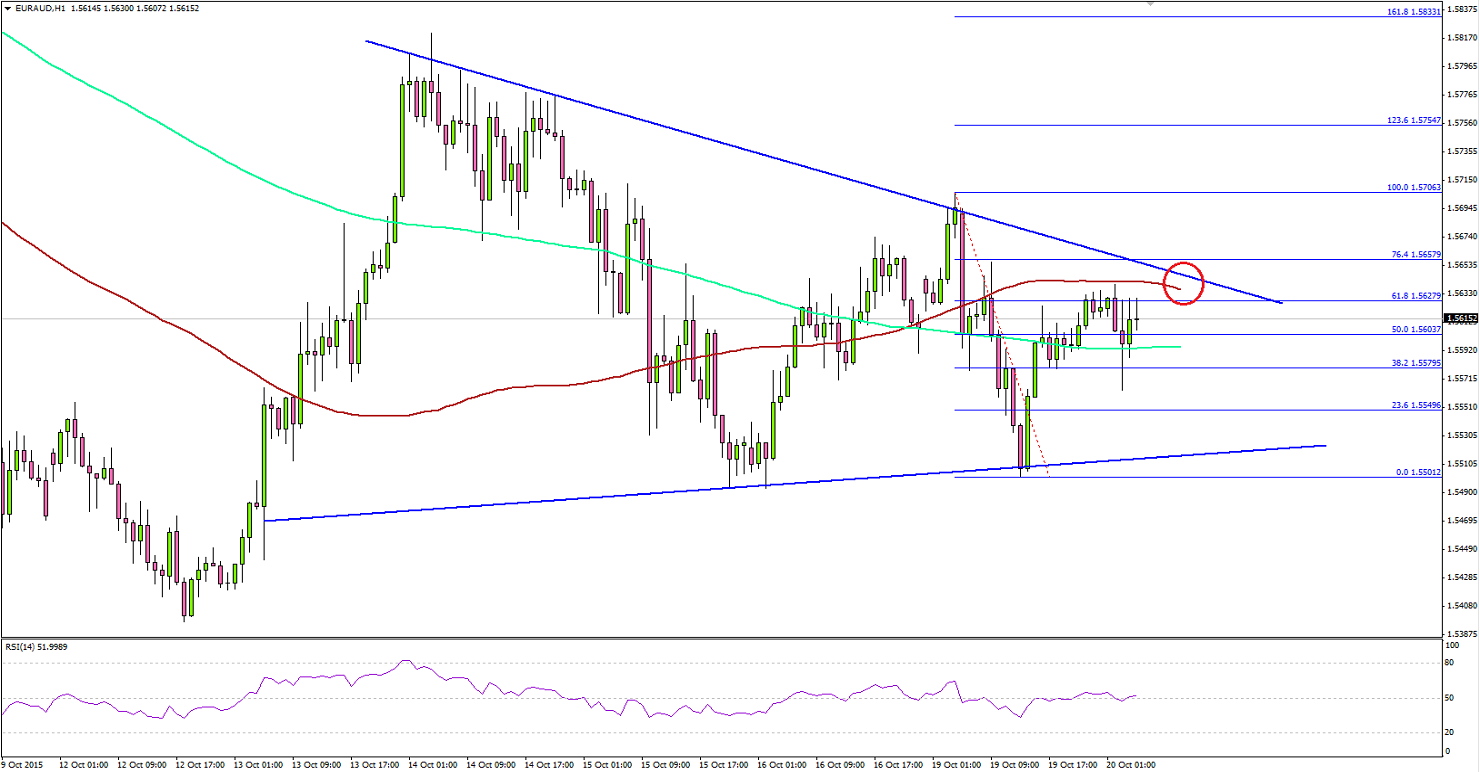 Currently, the pair is struggling to clear the 100 hourly simple moving average which is acting as a hurdle for the pair. Moreover, the triangle upper trend line is also above the 100 MA. So, we can say that there is a major resistance formed near 1.5630-60.There might be a break moving ahead and it would be interesting to see which way the pair moves in the near term.RBA Meeting MinutesEarlier during the Asian session, the minutes of the Reserve Bank of Australia meetings that give a full account of the policy discussion, including differences of view were published. The minutes were towards the positive side for the Aussie Dollar, as there was a note that the central bank was not planning to decrease the rates further. They see the current rates appropriate and supportive.Summing it up there was a mention that “the Board judged that it was appropriate to leave the cash rate unchanged at this meeting. Information about economic and financial developments, both domestically and abroad, would continue to inform the Board's assessment of the outlook and whether the current stance of policy remained appropriate to foster sustainable growth and inflation consistent with the target”.Overall, we can see some moves in the Aussie Dollar towards the upside if bulls get into the action. It also means there is a chance of a move lower in the EURAUD pair in the short term.German PPIToday in the Euro Zone, the German Producer Price Index will be released by the Statistisches Bundesamt Deutschland. The forecast is of a 0.1% decline in September 2015. If there is a miss in the result, then there is a possibility of the Euro moving lower.